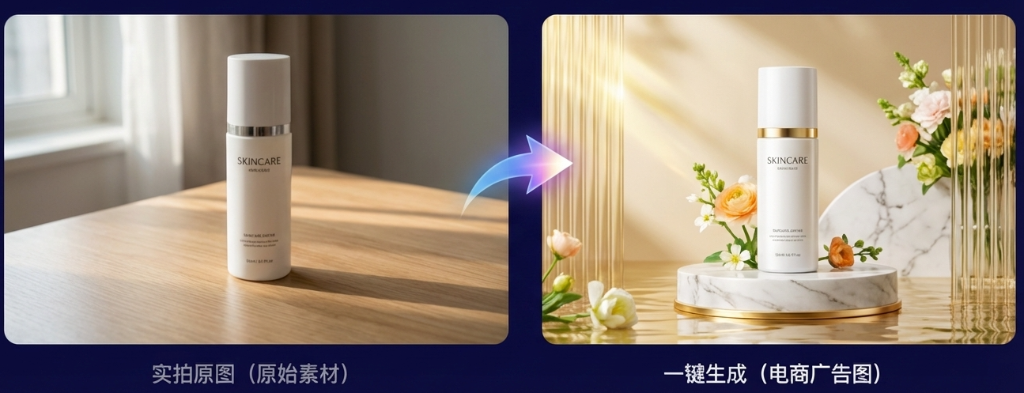 上传商品切图,选择风格,AI 自动生成高质量商业摄影级场景。 无需专业设计技能,秒级出图,降本增效。